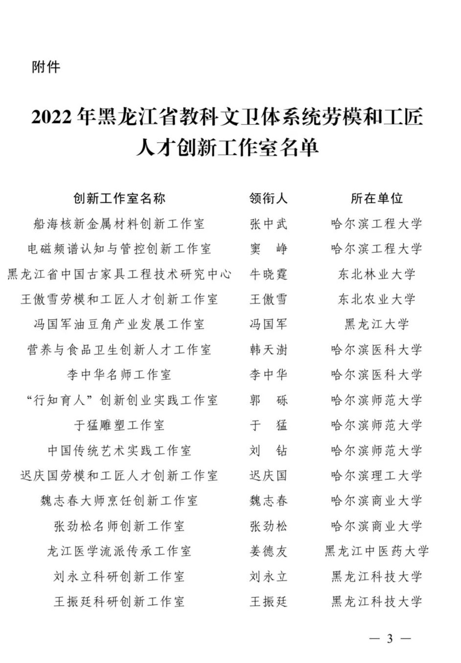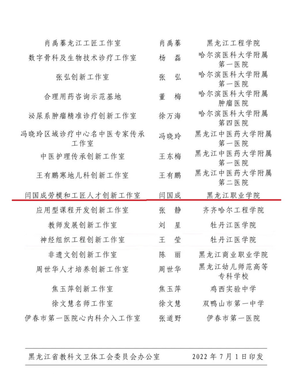 2022年度黑龙江省教科文卫体系统“劳模和工匠人才创新工作室”评审工作圆满完成,我校“闫国成劳模和工匠人才创新工作室”名列其中。