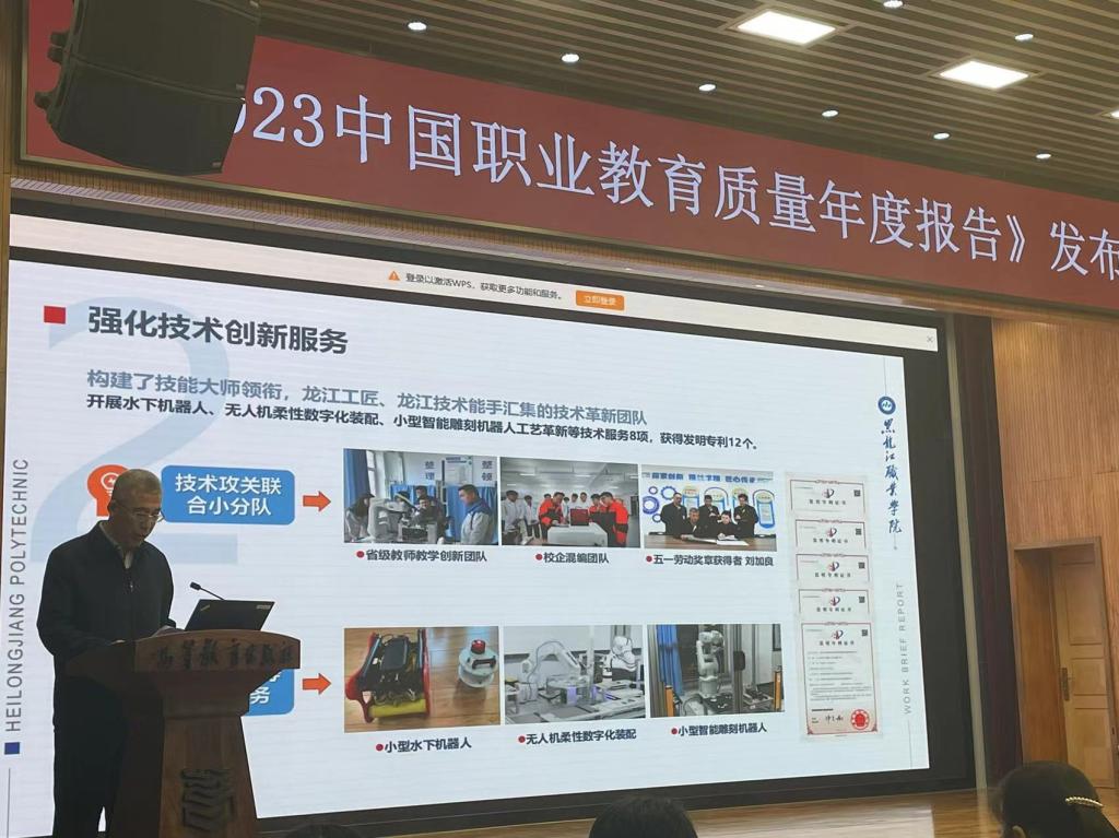 会议由《2023中国职业教育质量年度报告》发布和优秀典型案例、封面典型人物分享两个环节组成。我校《黑龙江职业学院与省总工会共建省级数字工匠学院并开展社会培训》典型案例入选《2023中国职业教育质量年度报告》。
