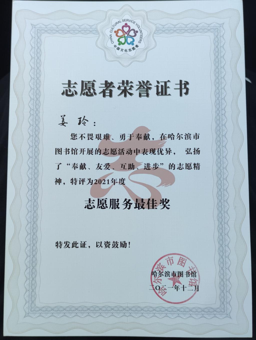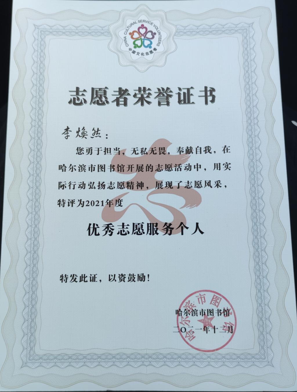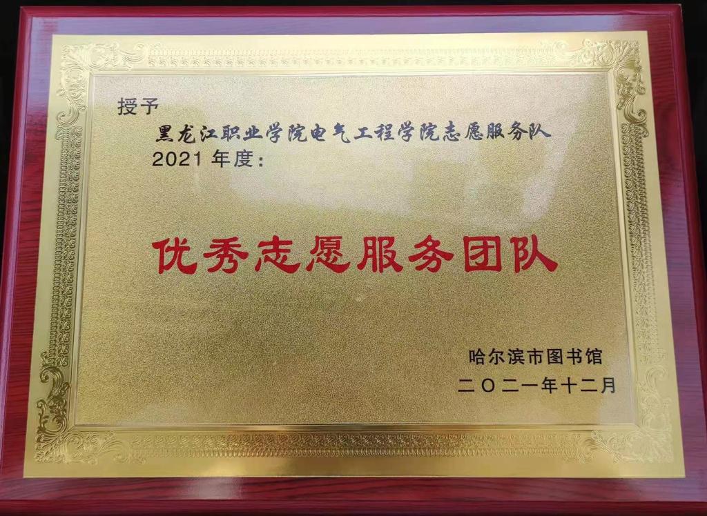 12月10日,哈尔滨市图书馆授予我校电气工程学院志愿团队“优秀服务志愿团队”称号,同时授予电气工程学院副院长李焕然“优秀志愿服务个人”、团支部书记姜玲“志愿服务最佳奖”的殊荣。
