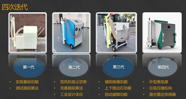 自跟随垃圾清洁车经过三次迭代,具备了稳定的性能,并在我校物业试用后取得良好的效果反馈。第一台样机,只验证了一个基本的跟随算法,比较初级,但基本满足了使用功能。第二台样机,增加了双风机,吸力有了大幅度提升,造型上更加美观,采用了PLC控制,性能更加稳定。第三台样机,增加了上下路边石功能、智能避障功能和一个辅助换桶功能。第四台样机,就是此次参赛的作品,已经进行了工业设计,不仅美观度得到了提升,而且增加了垃圾压缩功能。一次次的更新迭代,最终诞生了这台自跟随垃圾清洁车。