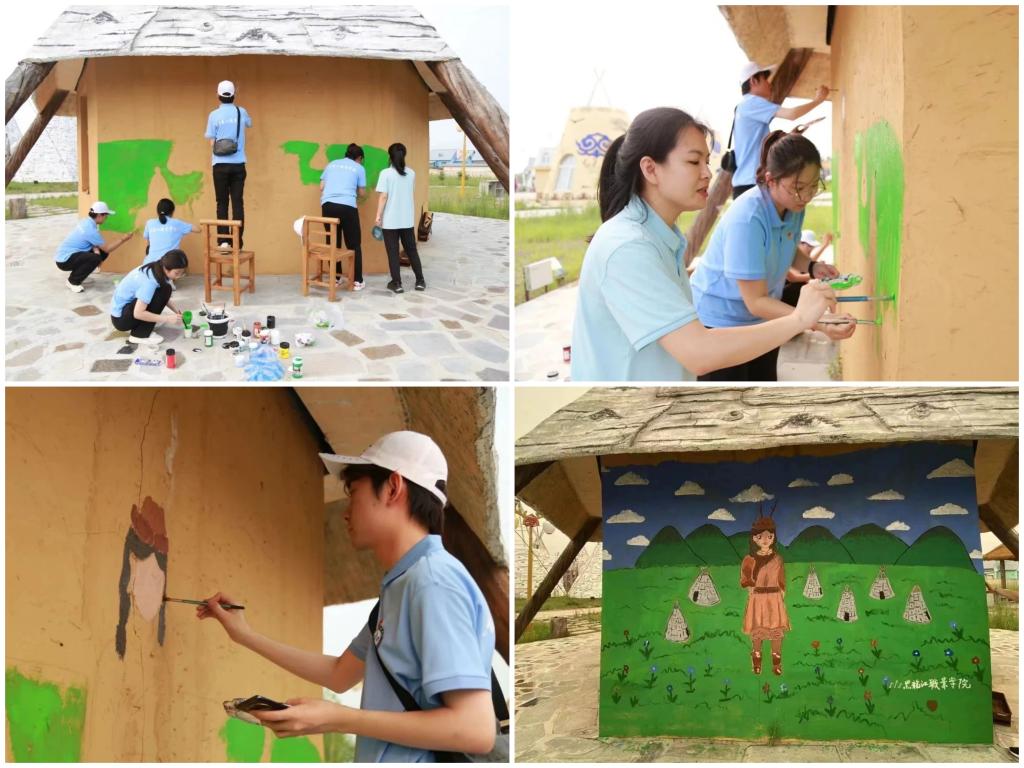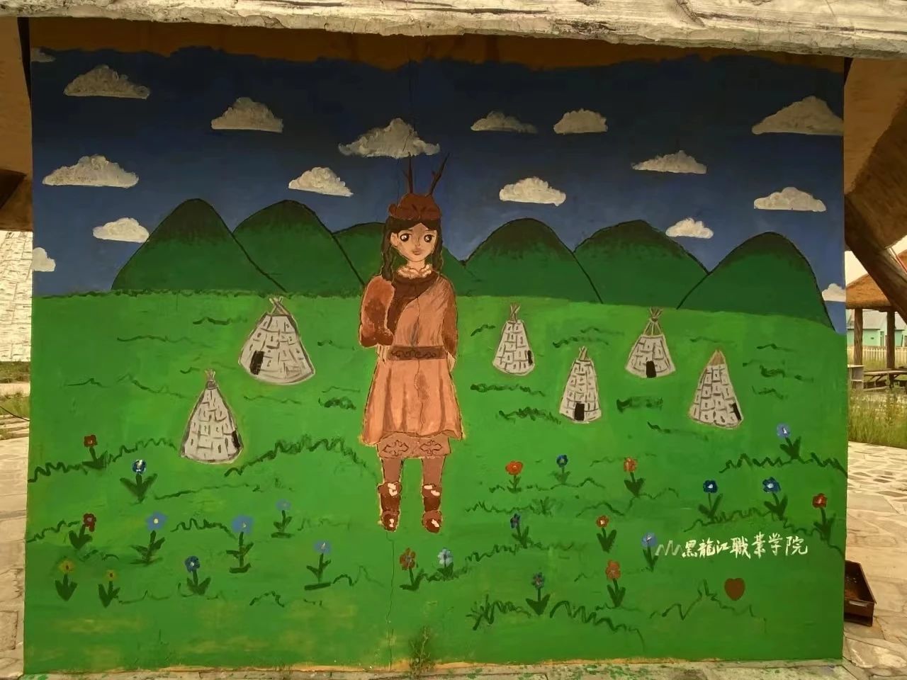 文化润乡,手绘风情展新颜。实践团在十八站鄂伦春民族风情园亲身体验了当地独特的风土人情,深入了解民族乡的历史沿革、民族文化和自然风光。队员们拿起画笔,结合鄂伦春民族乡的文化特色,精心构思、巧妙布局,创作出一幅展现自然风光、民俗风情的生动墙体画,为乡村增添了浓厚的艺术氛围,吸引众多游客和村民驻足观赏。