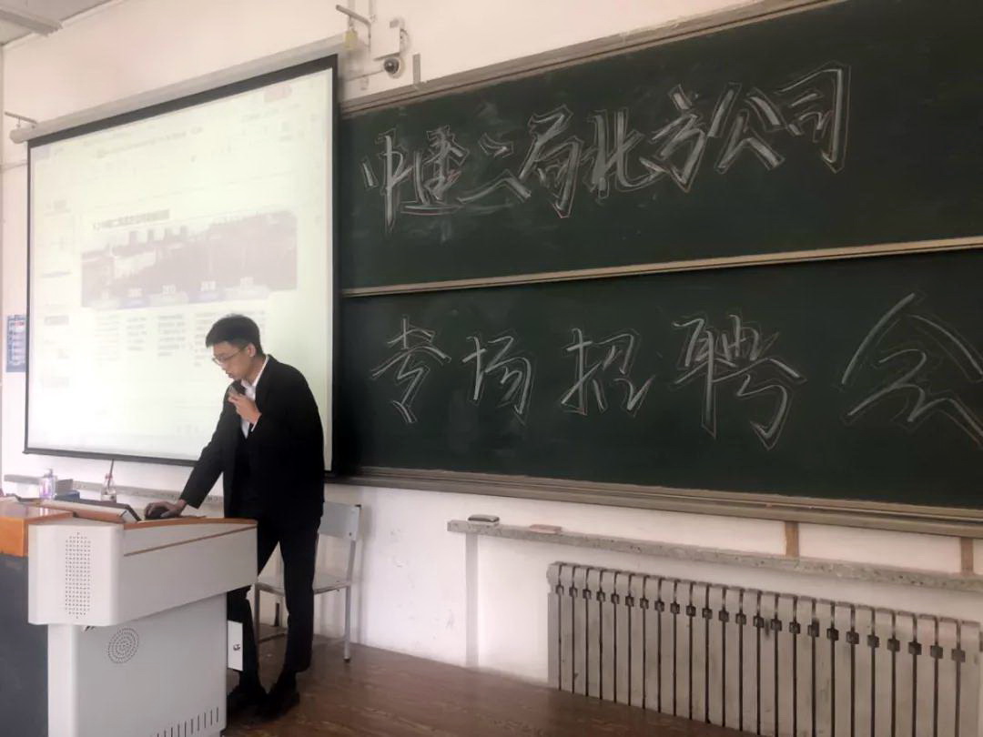 中建二局北方公司是中国建筑第二工程局有限公司直属区域公司,是以一业为主、多元经营的国有大型建筑施工企业集团,公司负责“黑吉辽”区域市场的经营与开拓,在哈尔滨、长春、沈阳、大连等多地设有分公司,营业收入超一百亿元。企业荣获过全国文明单位、全国最佳志愿服务组织、国家优质工程奖、中国钢结构金奖等多项殊荣,是一家综合实力雄厚的国有企业。中建二局北方公司人事经理现场进行了企业宣讲,对企业的发展历程、发展状况、企业文化向同学们做了详细地介绍,对同学们普遍关心的薪资水平、福利待遇、晋升前景等问题进行了耐心地解答。