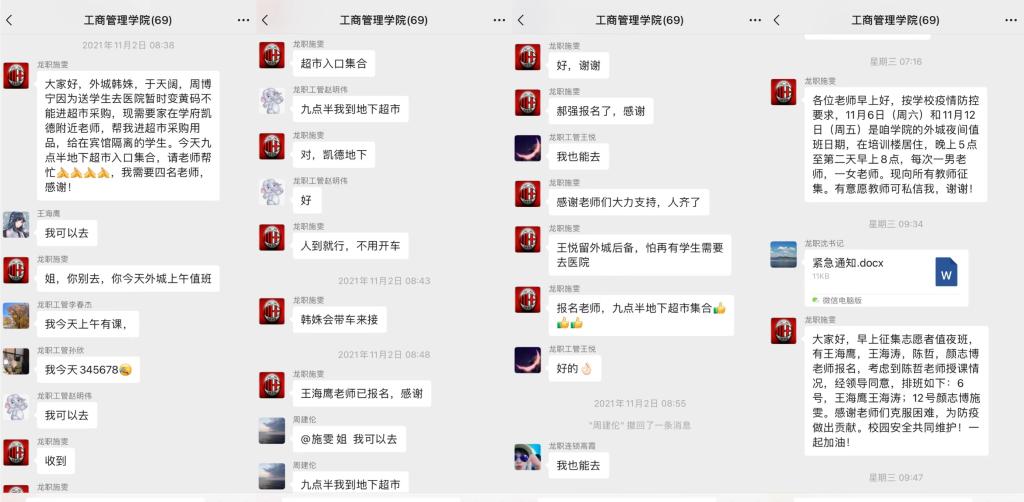年轻教师志愿者于天阔、周博宁连续待命多个日夜,不分昼夜地护送学生往返学校与医院,健康码都变为了黄码。王海涛、王海鹰、颜志博、施雯主动担任值夜班志愿者,王海涛、王海鹰夫妻更是宁愿把孩子送到父母那里也要前来支援。李春杰身为老党员,率先垂范连续多天为学生送餐、护送学生转移。颜志博不论白班夜班,需要他的时候,就立即出现。韩姝身患荨麻疹数月,病情持续未见好转,却一直坚守在转送学生的战线。王悦、王海鹰值班当晚得知酒店隔离的学生即将返校,一直待命等候,安顿好学生已是深夜。老干部处处长董庆波、继续教育学院教师齐放作为党员志愿者分配到学院,不辞劳苦数日多次参与学生转运安置工作。志愿者们带着爱与希望,科学有序地投入到疫情防控工作中,面临疫情和恶劣雨雪天气的双重打击,也毫不退缩,奋战在抗疫第一线。