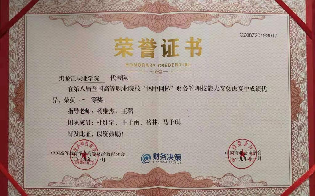 11月2日,在第八届全国高等职业院校“网中网杯”财务管理技能(财务管理决策)全国总决赛中,由会计金融学院教师杨继杰、王璐任指导教师,2018级会计专业学生杜红宇、马子琪、王子函、岳林组成的黑龙江职业学院代表队荣获全国一等奖。