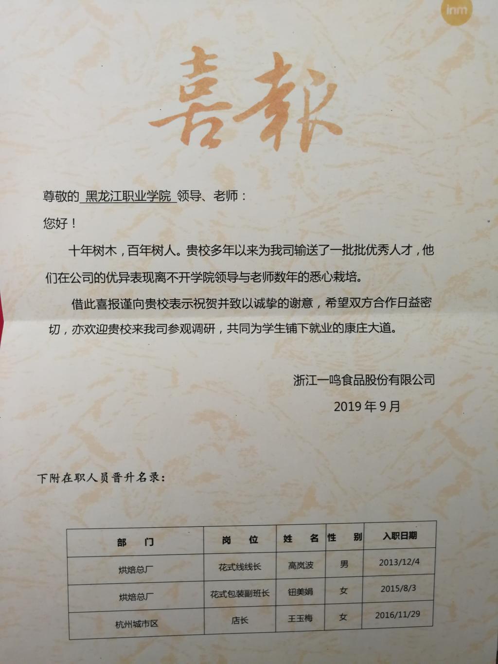 金秋九月,硕果累累,佳节来临,喜报频传。伴随着新一学期的开始,迎来了新中国第70个生日,浙江一鸣食品股份有限公司向我校发来喜报,祝贺我校食品药品学院自2013年与公司建立校企合作以来,至今已有23人晋升为店长及以上级别。几年以来,浙江一鸣食品股份有限公司与食品药品学院联系紧密,校企合作不断深入,使我校毕业生开阔了视野,增加了阅历,锻炼了能力。