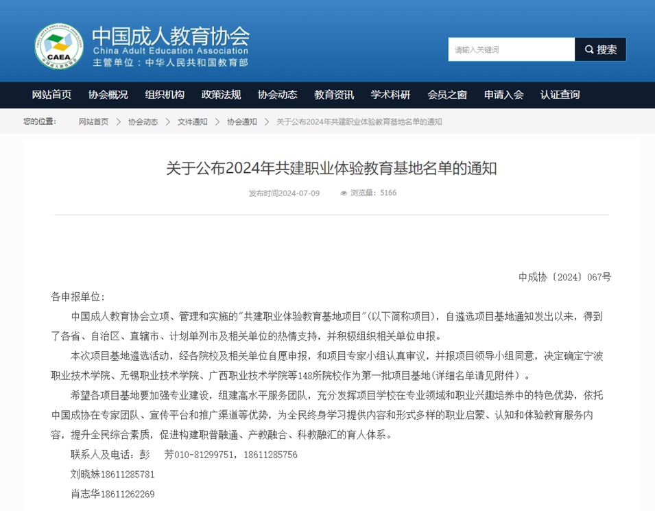 近日,中国成人教育协会公布了2024年共建职业体验教育基地名单,我校以其卓越的教育成果和创新的教学理念,成为全国148所入选院校之一。这不仅是对学院教育质量的认可,也是对学校在职业教育领域贡献的肯定。