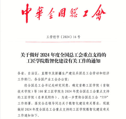 日前,经全国总工会研究同意,黑龙江省数字工匠学院(黒龙江职业学院)“入选2024年度全国总工会重点支持的工匠学院”。本次全国共有100家工匠学院入选,黒龙江省仅有两家。