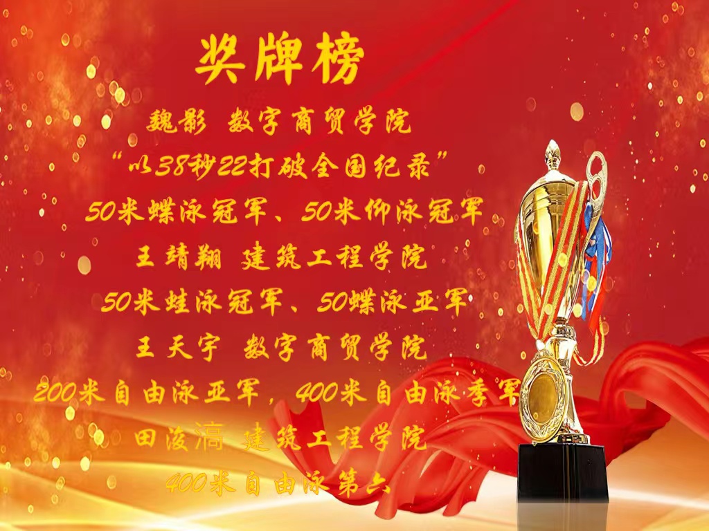 本次赛事由中国学生体育联合会主办、兰州市体育局承办,是我国大学生游泳项目的最高赛事之一。大赛将全国高校分为“北方赛区”和“南方赛区”,北方赛区赛事规模宏大,有北京大学、清华大学、北京体育大学等80所高校733名运动员参赛。我校游泳队首次冲进全国比赛,经过四天激烈角逐,队员们奋“泳”拼搏,发挥出色,凭借单项赛事的优异成绩荣获乙组女子团体总分第二名、乙组男子团体总分第四名、乙组团体总分第四名。数字商贸学院魏影同学夺得女子乙组50米蝶泳和50米仰泳两项冠军,并以38秒22成绩打破女子50米仰泳项目的全国赛会纪录。