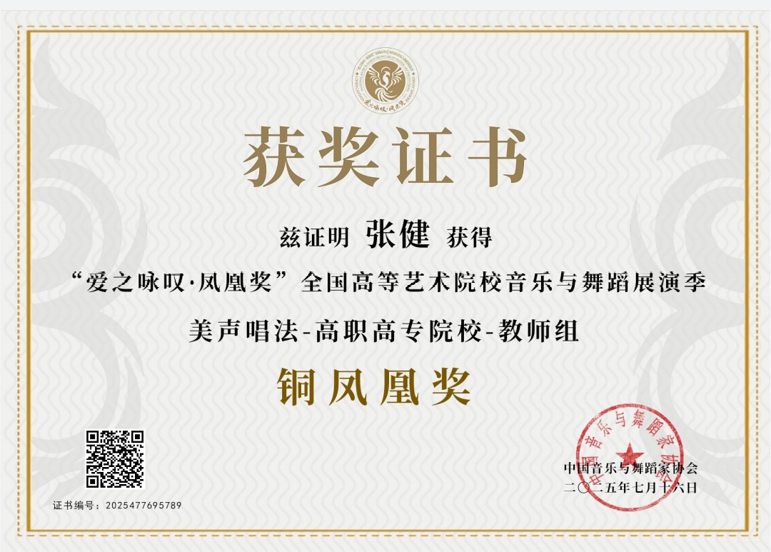 近日,首届“爱之咏叹·凤凰奖”全国高等艺术院校音乐与舞蹈展演季在沈阳圆满落幕。我校通识教育学院教师张健凭借咏叹调《黄河怨》《你知道吗?好妈妈》荣获美声唱法高职高专教师组铜奖。