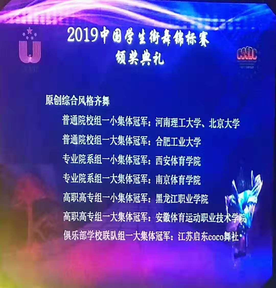 10月28日,2019中国学生街舞锦标赛圆满落幕。我校街舞队荣获原创综合风格齐舞高职高专组小集体冠军。