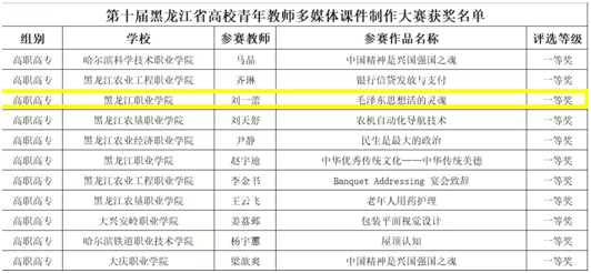 本次大赛经省教育厅批准,由黑龙江省高校师资培训中心举办,全省多所高校优秀教师积极参与,共评选出获奖作品73件。其中,本科院校组一等奖15件、二等奖25件,高职高专组一等奖11件、二等奖22件,刘一蕾老师的作品《毛泽东思想活的灵魂》荣获高职高专组一等奖,实现了学校在此赛项中零的突破。
