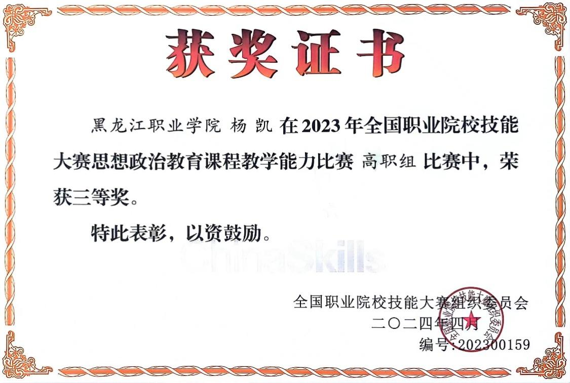 在2023年全国职业院校技能大赛思想政治教育课程教学能力比赛中,我校马克思主义学院教师杨凯荣获高职组三等奖,这是我校在该项赛事中思想政治教育课程教学领域首次获奖。