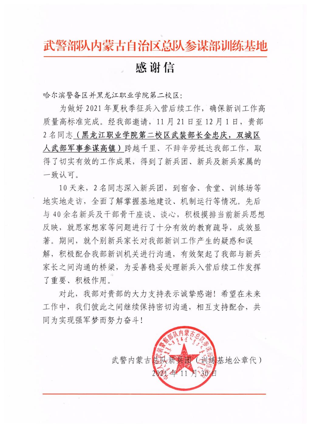 11月30日,一封由武警部队内蒙古自治区总队参谋部训练基地发出的感谢信,跨越千里传入黑龙江职业学院第二校区。信中对学校第二校区武装部部长金忠庆、双城区人武部军事参谋高镇,受部队邀请前往部队深入细致地开展思想政治工作给予高度评价。