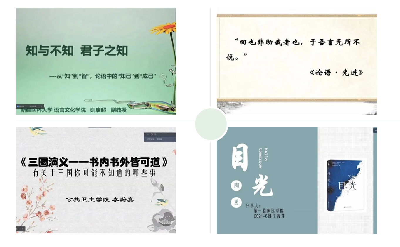 读书分享会上,主讲嘉宾语言文化学院副教授剡启超以《论语---“知与不知,君子之知”》为题,分享了孔子立身行道、兼济天下的深刻入世情怀,语言文化学院副教授于丽作了题为《论语---“师者大爱,医者仁心”》的读书分享,分享教学相长、因材施教、育人成才等经典教育理念;公共卫生学院预防医学2021-3班李蔚嘉同学和临床医学2021-6班王茜萍同学分别与师生们品读了《三国演义》和《目光》一书的心得。