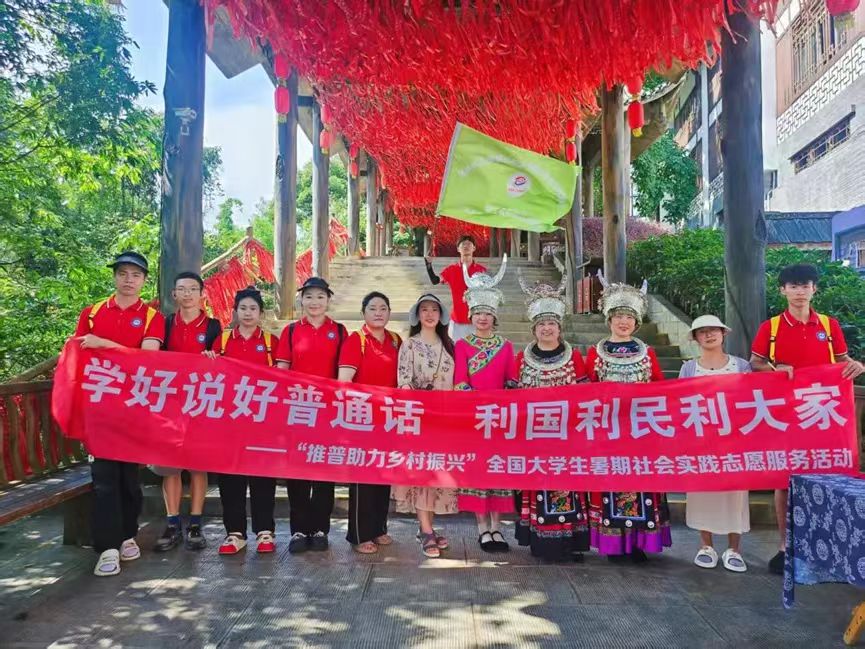 罗家坨苗寨市集,实践团挂标语、发自编《常用普通话50句》手册。队员们现场教学,鼓励村民“大胆说”,苗家嬢嬢成功挑战绕口令,获得小礼物奖励;苗族大爷用普通话朗诵文章,令人动容。队员入户一对一教学,与村民齐唱《爱我中华》,田嬢嬢用普通话告白:“五十六族都是自家人!”吊脚楼前,青春声线与苗族乡音穿透云雾缭绕的苗岭,成为铸牢中华民族共同体意识的坚实纽带。