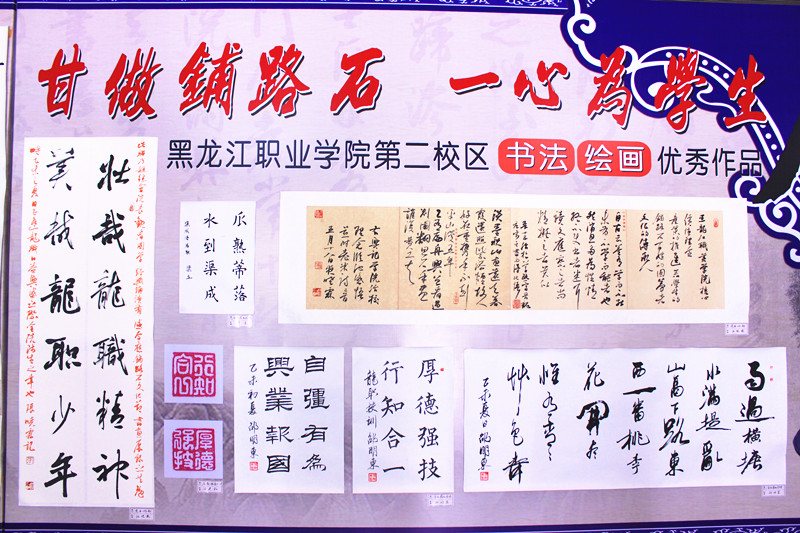 这次“双展”是按照学院党委《关于举办“我视党员”图片故事展的通知》和《学院首届“铺路石”文化节系列活动安排》的精神举办的。在活动过程中,共收到摄影作品179幅,书法、绘画、篆刻作品85件。黑龙江省书法家协会会员、党委工作部副主任张晓霖篆写了赵继会院长观看国学经典诵读后的感言:壮哉,龙职精神;美哉,龙职少年。信息工程学院多智新老师在她的书法作品中饱含深情地写道:我只愿做一颗小小的铺路石,坚定地和泥土站在一起,构成黑龙江职业学院向未来延伸的大道。后勤服务中心冯建柏用心篆刻了校训:厚德强技,行知合一。精美的作品展现了第二校区干部职工心系“龙职”、服务学生、甘做“铺路石”的高尚情怀,同时,也真实反映出第二校区广大党员干部在平凡岗位上无私奉献、爱岗敬业、务实创新、勇于进取的良好作风。