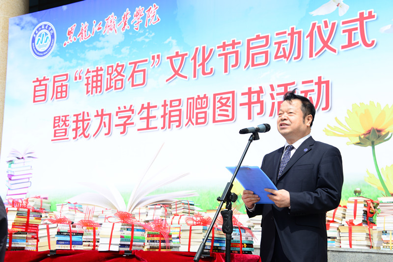 在致辞中,赵院长指出,将每年的五月份定为文化节,是学院党委审时度势做出的重要战略部署,是我们学院治校理政的又一个创举,标志着学院文化建设进入系统化、全面化和常态化的新阶段。自2010年以来,特别是近三年,在谋划学院发展大局时,我们始终坚持用精神凝聚力量、用文化统一思想的治校理念,自觉将文化建设作为学院发展建设的重要组成部分,产生了以学院精神和核心价值观为代表的一系列文化成果,为形成“龙职”品牌发挥了巨大作用。现在,我们站在优秀国家骨干高职院校和全国高校就业50强的起点上,提升“龙职”品牌质量,实现名校强校目标,成为“省内标杆、国内一流”院校,压力更大,任务更重,要求更高,迫切需要我们通过加强文化建设,进一步坚定思想信念,进一步激发精神力量,进一步提升管理境界。通过设立文化节,以及开展“我为学生捐赠图书”等一系列文化活动,就是以弘扬社会主义核心价值观为统领,以立德树人为根本目标,积极构建文化育人和文化管理体系,使学院精神和核心价值观成为我院实现新发展再上新台阶的灵魂和旗帜,为建设名校强校提供精神动力和文化支持。