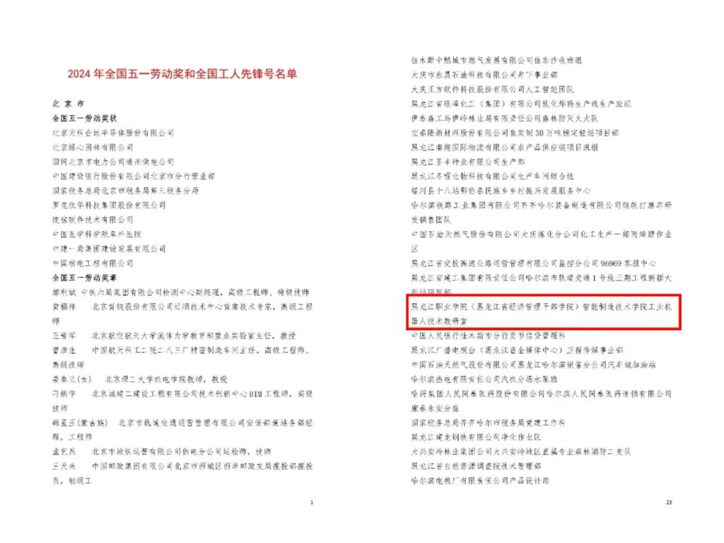 工业机器人技术教研室2023年荣获省级工人先锋号,着力服务东北振兴国家战略,紧扣支撑龙江先进制造战略性新兴产业数字化升级方向,在教学改革、学生培养、社会服务等方面树立了龙江榜样,形成由省级技能大师领衔,龙江工匠、龙江技术能手为骨干的科教融汇队伍,在培养装备制造类战略人才,培育技能大师、创新团队、大国工匠等方面作出突出贡献。