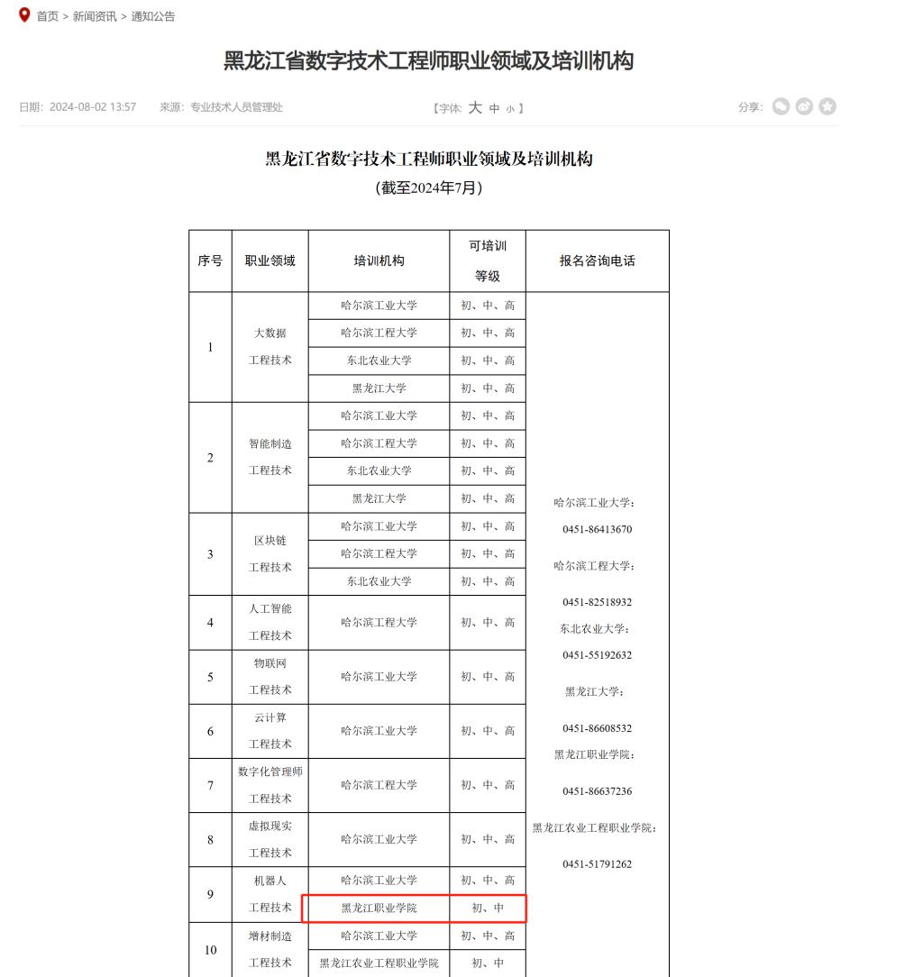 日前,黑龙江省人力资源和社会保障厅公布了黑龙江省第三批数字技术工程师培训机构名单,我校凭借扎实的专业实力与丰富的培训经验,获批成为机器人工程技术人员(初级、中级)培训机构。