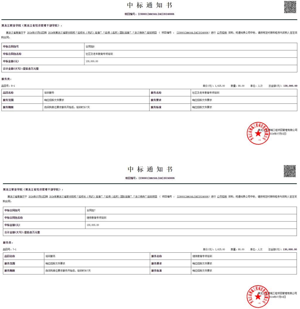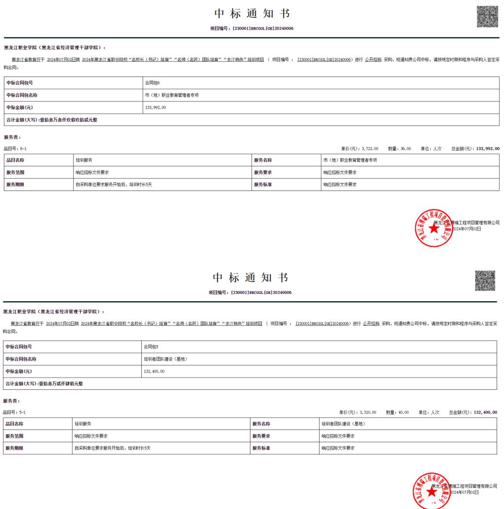 7月2日,我校在2024年黑龙江省职业院校“名校长(书记)培育”“名师(名匠)团队培育”“龙江特色”等培训项目中脱颖而出,投递的4个标段项目全部中标,中标金额共计52.63万元。