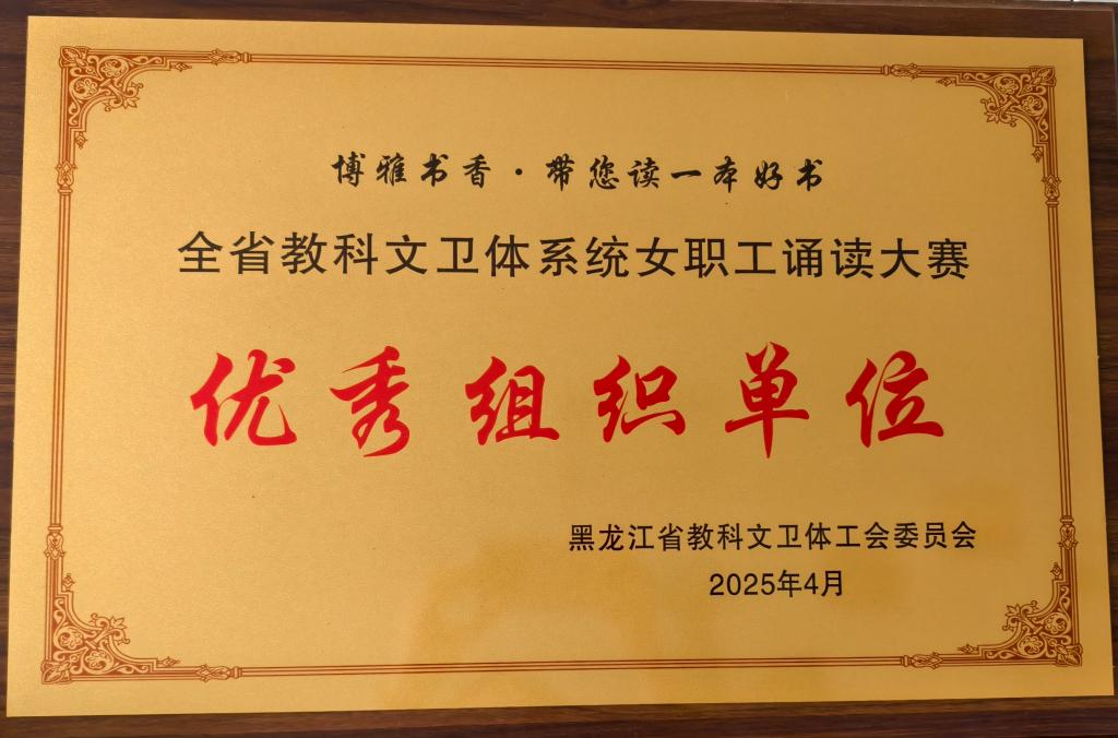 近日,由省总工会主办、省教科文卫体工会承办的迎庆中华全国总工会成立100周年“博雅书香・带您读一本好书”全省教科文卫体系统女职工诵读活动决赛在黑龙江省工会事业发展中心精彩上演。我校精心准备和积极参与荣获“优秀组织单位”奖。