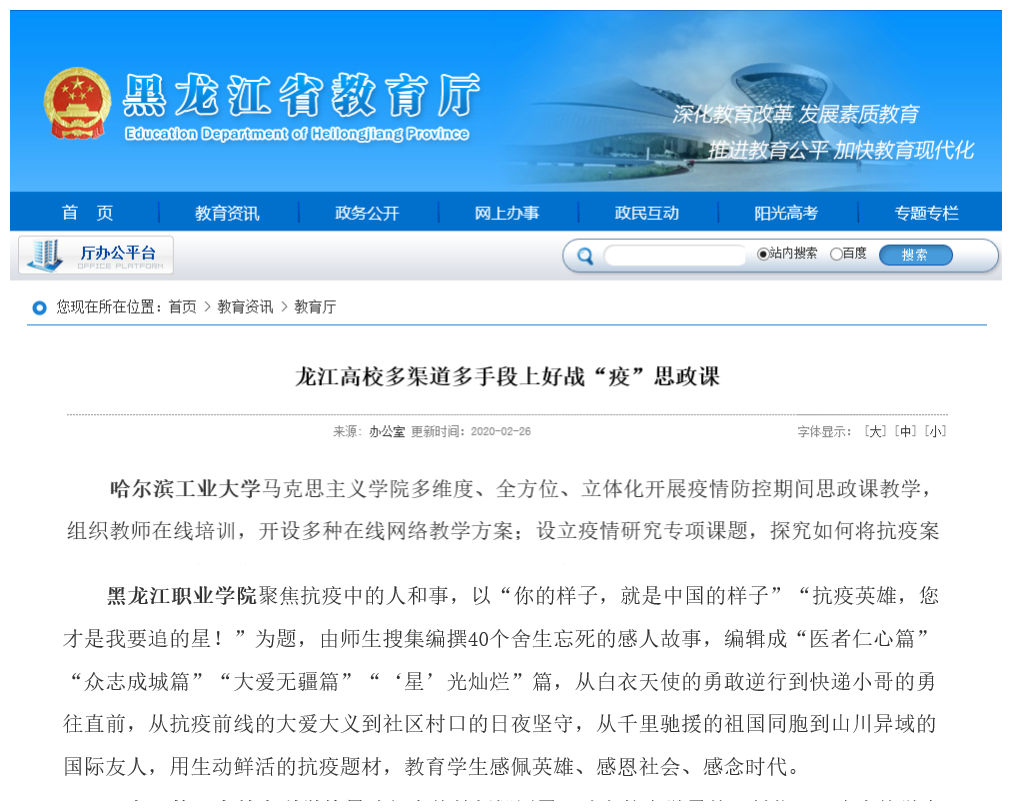 黑龙江职业学院以立德树人为根本,高度重视思政课建设。尤其是党的十八大以来,学校深入贯彻习近平总书记在全国高校思想政治工作会议、全国教育大会、全国思政课教师座谈会上的讲话精神,把思政课建设摆上学校发展的重要位置,加强政策保障、深化教学改革,为教师认真教好思政课、学生积极学好思政课创造了良好的氛围,推进“龙职”思政课建设取得了系列成绩,发挥了铸魂育人的关键作用。