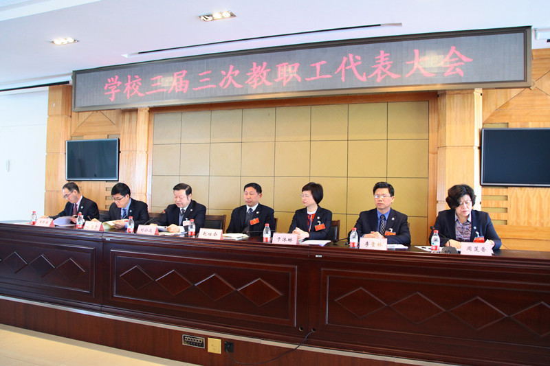 下午3时50分,代表们审议通过了《学校行政工作报告》《关于2015年学校财务预算执行情况和2016年学校财务预算编制情况的报告》《关于提案处理意见的报告》《学校“十三五”发展规划》《学校章程》和《学校关于全面推行成果导向教育教学改革的意见》。