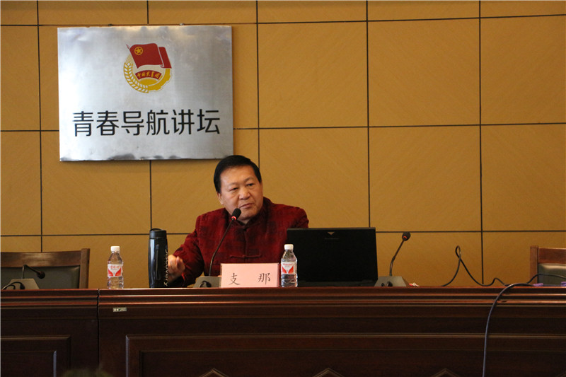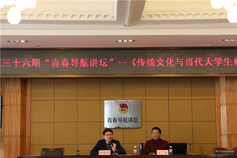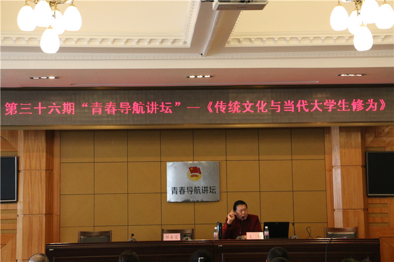 12月12日,第36期“青春导航讲坛”成功举办,甲骨学者、训诂学者、考古学者、新朴学创始人,吉林省华夏文化研究会会长支那先生应邀做客本期讲坛,为同学们作题为《传统文化与当代大学生修为》的讲座,来自各二级学院2018级同学代表近240人聆听本次讲座。讲坛活动由校团委书记邹春雷主持。