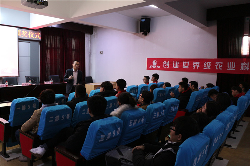 颁奖仪式后,石成金给2017级大北农冠名班学生上了2018年的最后一堂课,并鼓励全体学生要学习“大北农人”的创业精神,珍惜机会,刻苦学习,勇于实践,争做“大北农人”,实现自己的人生价值。