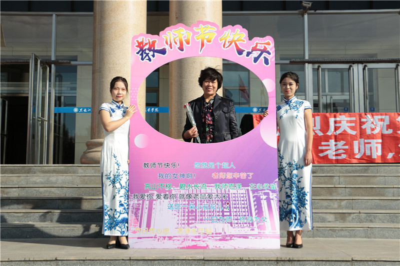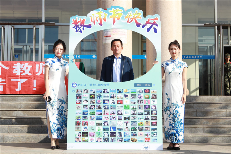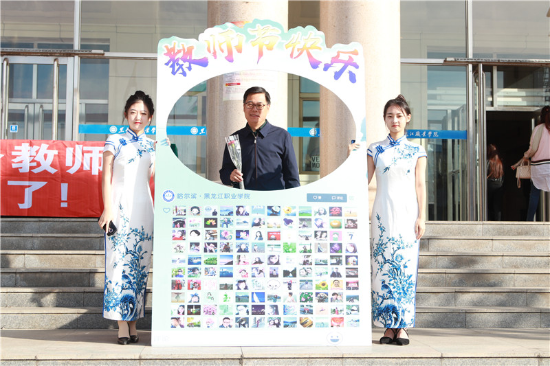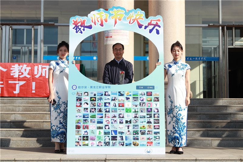 9月10日清晨,“龙职”校园弥漫着浓浓的教师节的喜庆氛围,看校园大屏,滚动播放着“晨曦细雨育桃李,金秋硕果慰园丁”一句句祝福教师的标语;听校园广播,萦绕着“长大后我就成了你”一首首赞美教师的歌曲;望清华楼前,“热烈庆祝第34个教师节,老师您辛苦了!”大型横幅亮出主题,两块合影留念的相框为“龙职”老师提供了节日拍照的道具,相框上印制的点赞和评语将学生们对老师心底的赞美赫然于板上,一群身穿蓝色马甲的学生干部整齐地站成两列,一句句问候“老师,您辛苦了!”、一个个深深的鞠躬、一朵朵鲜艳的康乃馨……无不表达着“龙职”学子对老师最深切的祝福。许多手持鲜花的教师都欣喜的走到相框前,用手机记录下这一难忘的幸福时刻。