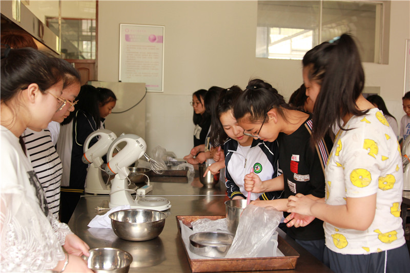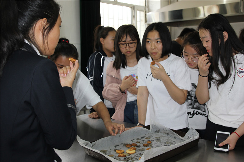 同时,邀请中学生体验“成果导向+行动学习”新模式下的“龙职”课堂,课上由专业教师与优秀学生共同组成教学小组现场指导孩子们制作各种创意曲奇。面对如此丰富、有趣的职教课堂,孩子们都非常兴奋,充满好奇,品尝自己亲手设计制作的曲奇无比开心。