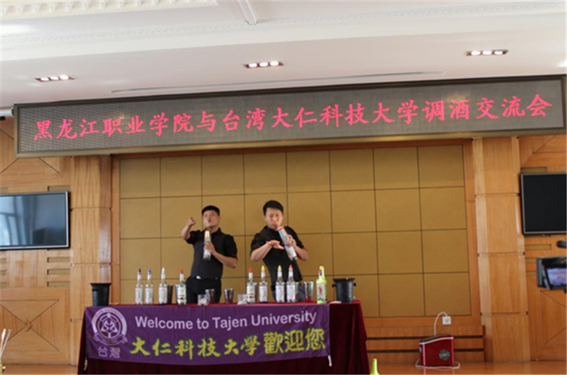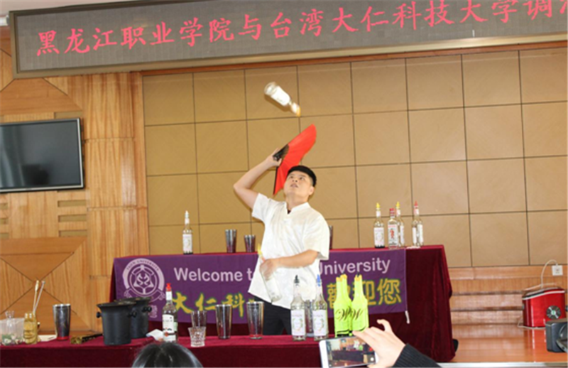交流会后,国际知名调酒大师、亚洲花式调酒记录保持者大仁科技大学教师许博胜带领学生现场调制鸡尾酒,介绍酒水的品评与调制方法,并为酒店管理专业的全体学生表演了英式调酒,单人花式调酒,双人花式调酒等。精彩绝伦的花式调酒,使得现场气氛非常热烈,获得学生的阵阵掌声。学生们积极参与交流活动,表现出极高的学习热情,本次活动既提高了学生的专业技能,又开拓了专业视野。