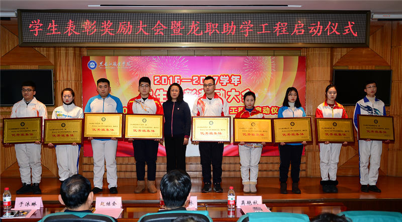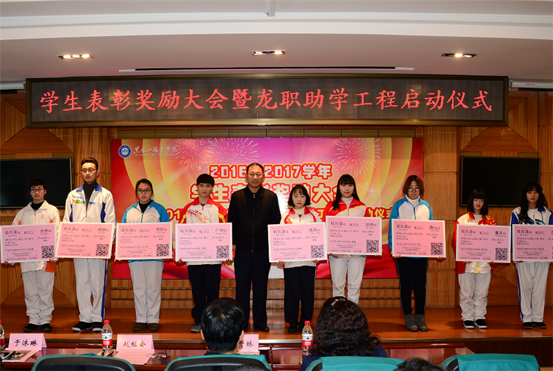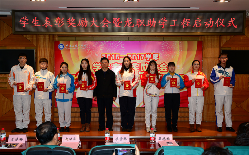 12月13日,学校2016—2017学年学生表彰奖励大会暨2017—2018学年龙职助学工程启动仪式在报告厅隆重举行。学校党委书记赵继会,党委副书记、校长于沐琳,副校长李贵林、王明海、吴艳秋,学校党委委员、组织部部长钟敏强出席会议,受表彰和受资助学生代表,相关处室负责人,各二级学院领导,全体辅导员参加会议。王明海主持会议。