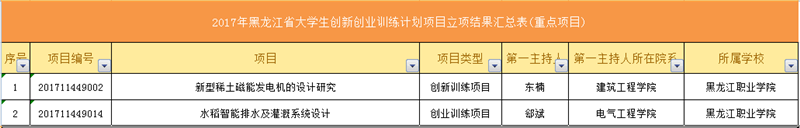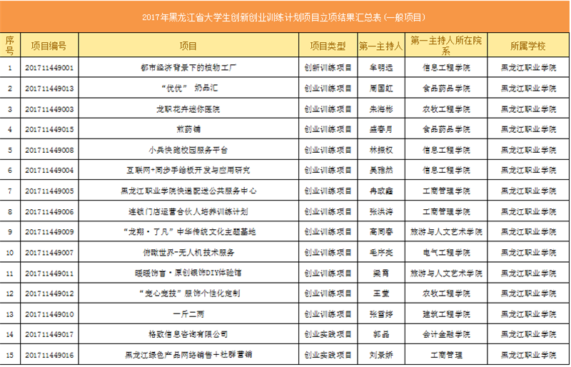 6月12日,省教育厅印发《关于公布2017年黑龙江省大学生创新创业训练计划立项评审结果的通知》(黑教高函〔2017〕294号)文件,经过黑龙江普通高等学校大学生创新创业计划评审委员会专家评审,共评选出全省重点项目520项、一般项目942项和指导项目945项。其中我校申报的17个项目全部通过审核,获得立项资格,其中省级重点项目2个、一般项目15个。在今年“大创计划”项目申报工作中,我校双创办精心组织,全校师生积极参与,踊跃报名,申报项目涵盖网络营销、电商服务、技术研发等众多领域,突显创新性和实践性,进一步发挥我校作为国家骨干高职院校和黑龙江省首批创新创业教育示范高校,在创新创业工作上的引领和示范作用。 本次立项申报,学校聘请企业精英和学校教务处、科研处资深教师等5位评委,通过对项目计划书创新性、可行性、研究计划、经费计划以及项目实施条件等方面的综合评审打分,最终从27个项目中评比筛选出17个优质项目推送省教育厅,并全部获批省级立项。“大创计划”点燃了“龙职”学生的创业热情,在学校进一步营造大众创业、万众创新的浓厚氛围。