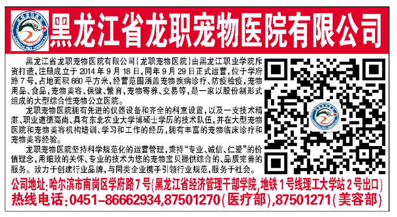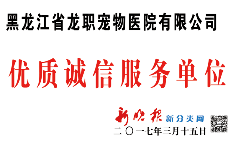 3•15来临之际,新晚报组织哈尔滨各个行业、企业参加优质诚信企业评选活动,并于3月15日当天的新晚报上用两个版面推荐并展示入选的60余家诚信单位。“龙职”宠物医院被授予“优质诚信服务单位”。
