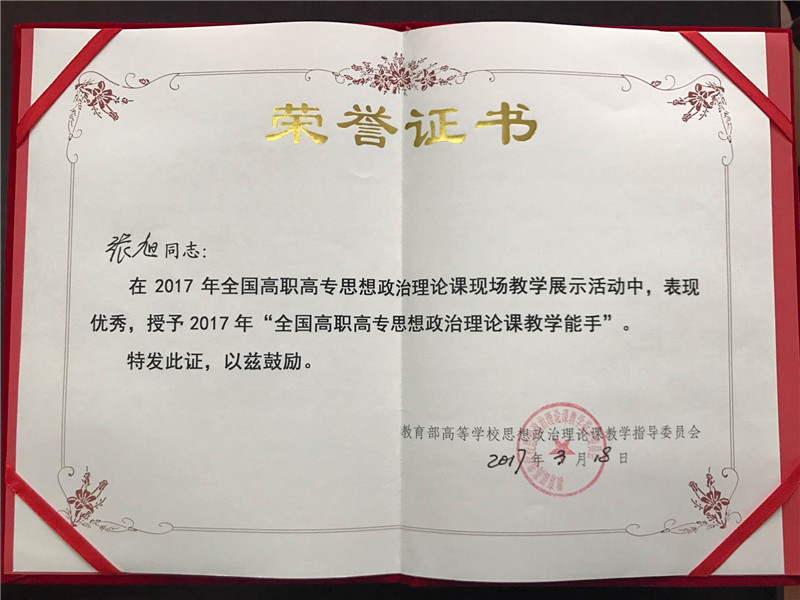 我校思想政治教研部教师张旭在全国高职高专思政课现场教学展示中获得二等奖,被教育部高校思政课教指委授予2017年“全国高职高专思想政治理论课教学能手”荣誉称号。