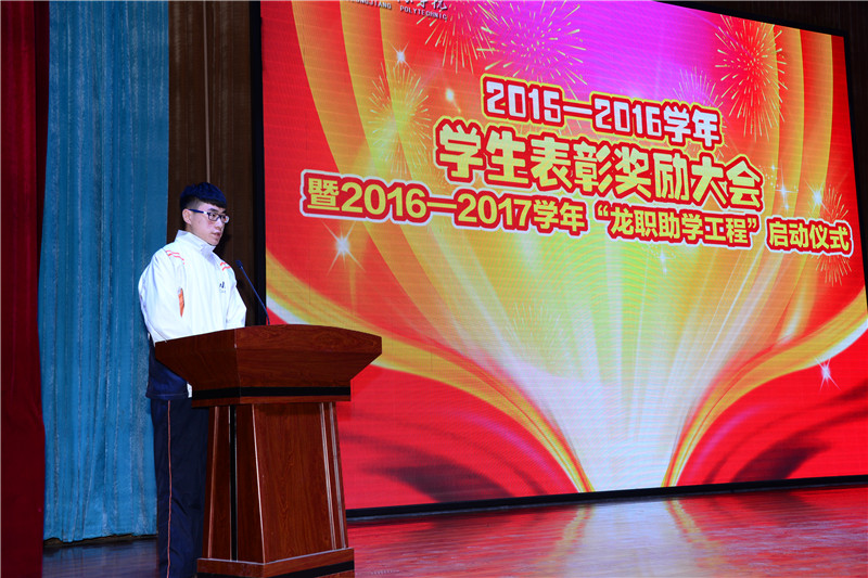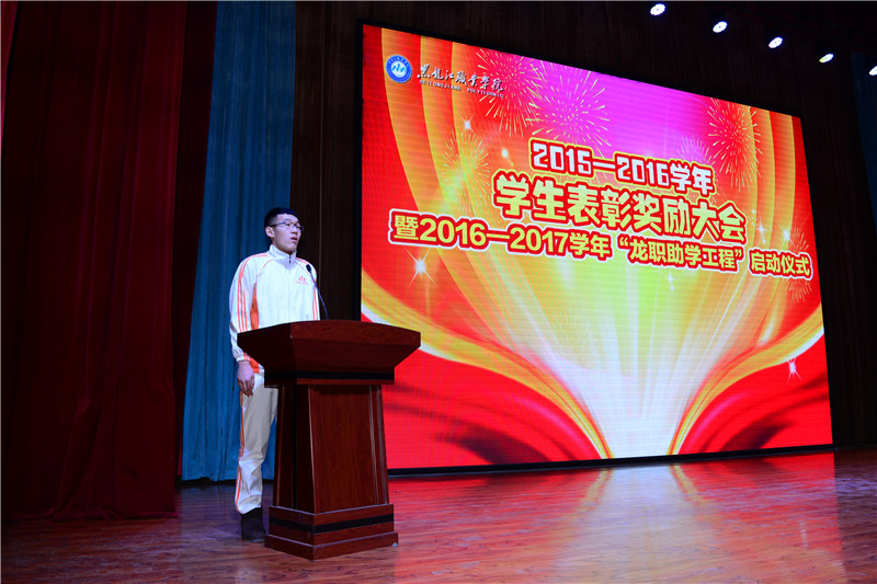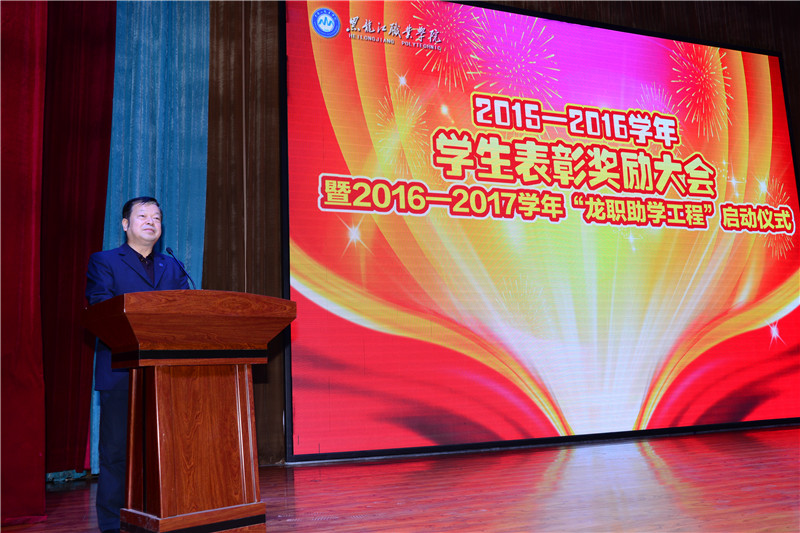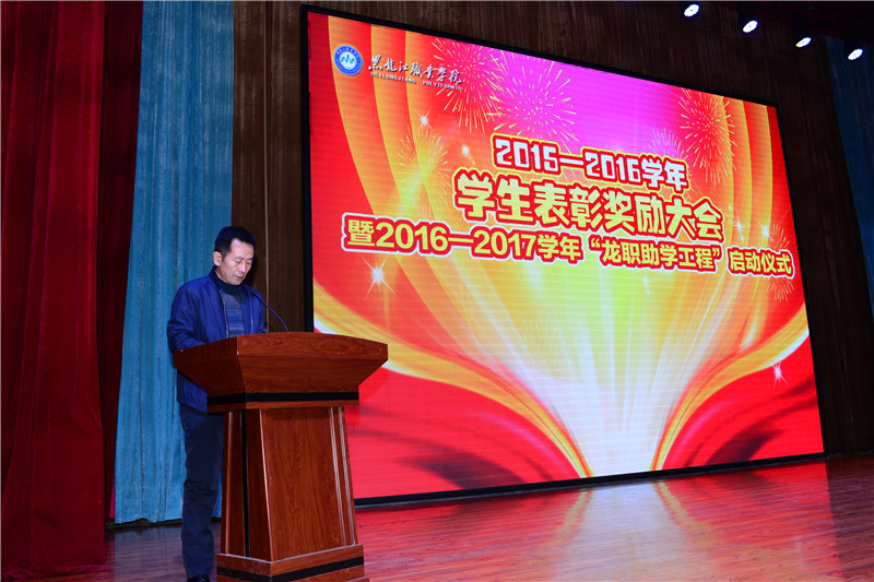 12月14日,学校2015—2016学年学生表彰奖励大会暨2016—2017学年“龙职”助学工程启动仪式隆重举行。学校党委书记赵继会,校长、党委副书记于沐琳,学校党委副书记周家郁,常务副校长刘公远,副校长郑福贵,纪委书记周莲香,副校长吴艳秋,党委委员组织部长钟敏强,龙职院副校长孙福忠,龙职院副校长刘莉等校领导出席会议,受奖励资助的学生代表、各部门负责人和干部教师代表800于人参加了会议。会议由周家郁主持。