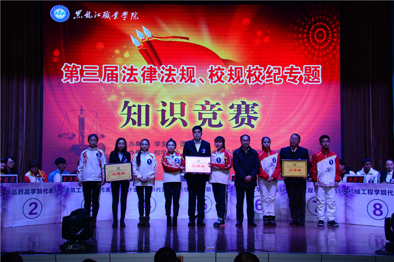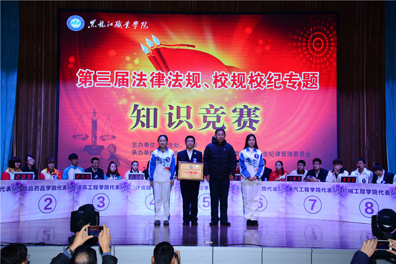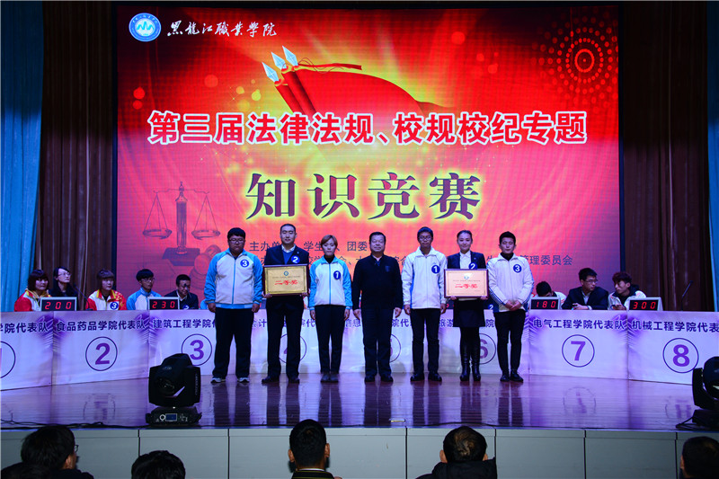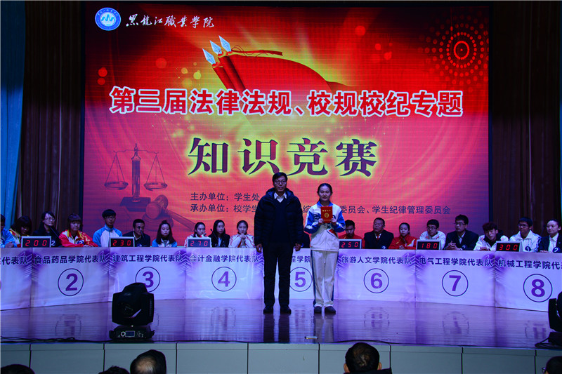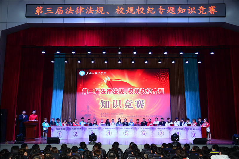 11月30日,学生处、团委在学府会堂举办第三届“法律法规、校规校纪”专题知识竞赛。校党委书记赵继会、校长于沐琳、党委副书记周家郁、常务副校长刘公远、副校长王明海、党委委员组织部长钟敏强等出席,各二级学院党总支书记、学管副院长、全体辅导员和800余名师生参加活动。