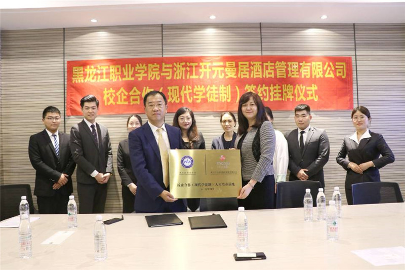 2010年,学校酒店管理专业与开元酒店集团开展合作,已携手走过9个年头,双方共同见证彼此发展与壮大。2018年,刘虹副总裁、胡晓缨总监、刘金云经理到访学校酒店管理专业,双方就曼居总经理助理定向班项目达成合作意向,选拔2016级徐泽东、于君生等6名优秀学生进入曼居酒店集团,采用现代学徒制方式进行培养,在校企双方共同努力下,此次试点非常成功,学生综合素质与职业能力获得较大提升。2019年4月,开元曼居酒店管理公司又成功签约哈西站万达项目,进一步推进校企双方对现代学徒制探索与合作。按照合作协议规定,双方本着“资源共享、相互协作、互惠互利、共同发展”原则,通过校企合作方式,为学生搭建创业平台,扩宽就业渠道,提高学生专业实践能力,共同培养酒店管理专业人才。