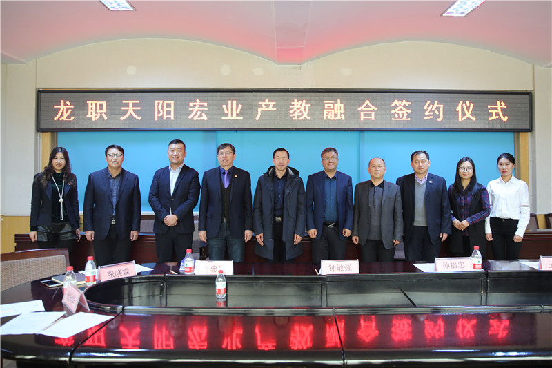 钟敏强代表学校对企业代表表示热烈欢迎,介绍我校综合实力和发展前景,表示在将来的合作中坚持“面向未来、加强合作、优势互补、共同发展”的宗旨,建立并发展双方的友好合作关系。景士俊就公司情况,合作内容进行了详细阐述并表达出深度合作的良好愿望。随后,钟敏强和景士俊分别代表校企双方签订《龙职•天阳宏业产教融合协议》,孙福忠和景士俊共同为产教融合基地揭牌。