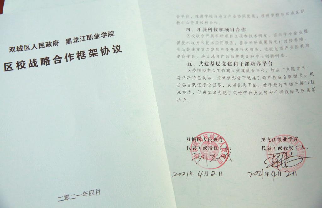 4月26日,随着哈尔滨市双城区人民政府区长刘志成和黑龙江职业学院校长王利文,分别在《区校战备合作框架协议》上落笔签字,标志着学校与属地政府全方位、多层次、宽领域战略合作的大幕已正式拉开。