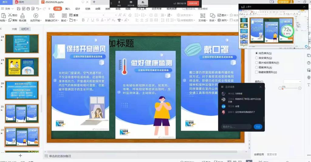 活动以班级为单位,采取钉钉、腾讯会议、微信视频等线上形式进行。农牧工程学院开展以“科学防控疫情,文明健康随行”为主题的教育活动,辅导员向同学们传达了学校疫情防控工作有关要求,询问了当前所处中高风险地区学生健康状况,并向学生普及疫情防控知识,帮助学生在常态化疫情防控期间继续筑牢防疫观念,稳妥有序推进学生的开学复课。通过疫情防控教育会的开展,同学们纷纷表示会注意监测自己的身体情况,及时报告健康情况;平时在学习生活中要合理安排作息时间、提高网课学习质量、注重膳食搭配、出入公共场所要佩戴医用口罩等。