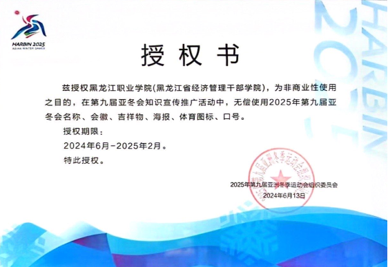 近日,我校荣获2025年第九届亚洲冬季运动会组织委员会颁发的亚冬会标志非商业性使用授权书,兹授权黑龙江职业学院(黑龙江省经济管理干部学院),为非商业性使用之目的,在第九届亚冬会知识宣传推广活动中,无偿使用2025年第九届亚冬会名称、会徽、吉祥物、海报、体育图标、口号。