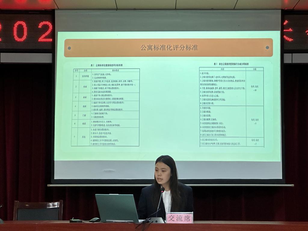 ▲公寓辅导员王洪多讲解标准化寝室建设