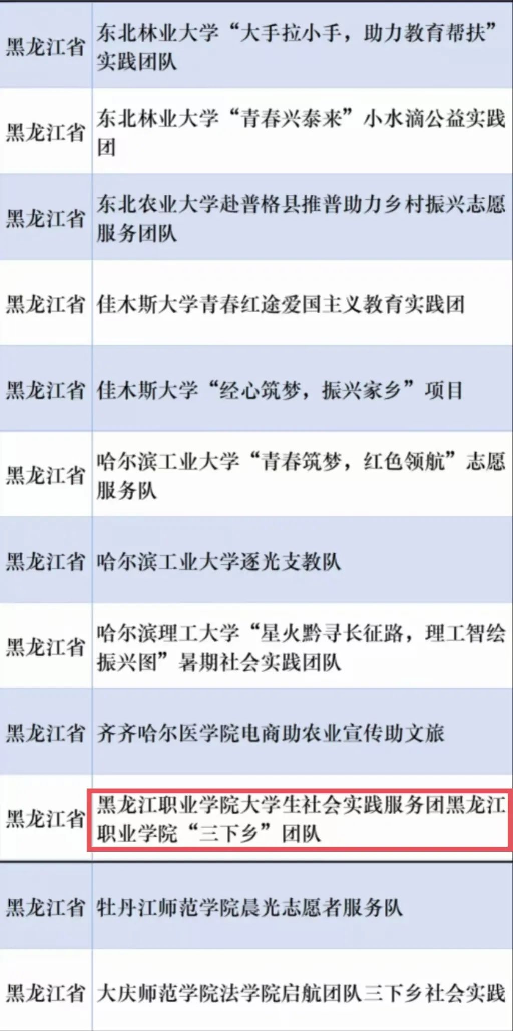 我校黑龙江职业学院大学生社会实践服务团黑龙江职业学院“三下乡”团队成功入选优秀项目,作为省内唯一一家高职院校荣登榜单。我校社会实践团以实际行动响应国家号召,深入农村,助力乡村振兴,展现出青年学子的责任与担当。