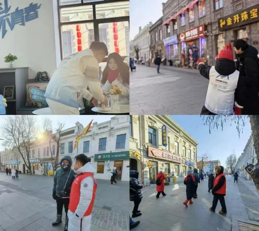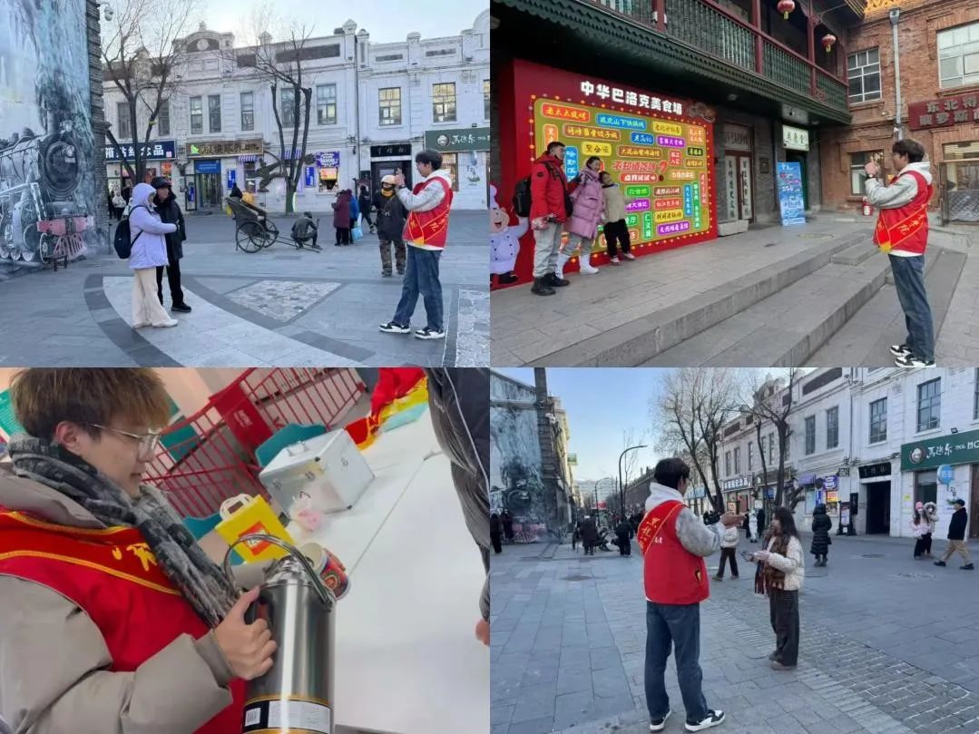 此次志愿服务活动是我校校团委响应团市委号召,组织我校青年志愿者们在道外中华巴洛克街区和青年之家开展的志愿活动,期间志愿者们身着统一的志愿服装活跃在街区的各个角落,为中华巴洛克街区增添了一抹亮丽的色彩。志愿者们不仅向外地游客提供提供免费热水、暖贴等贴心保暖物品。同时还作为向导带领游客们在中华巴洛克街区进行导览、讲解街区历史文化,主动帮助游客拍摄游客照。此外,志愿者们还兼顾街面环境清洁与现场秩序维护。他们手持垃圾袋和夹子,仔细捡拾地面垃圾,同时积极劝导不文明行为,让街区环境更加整洁、秩序井然。