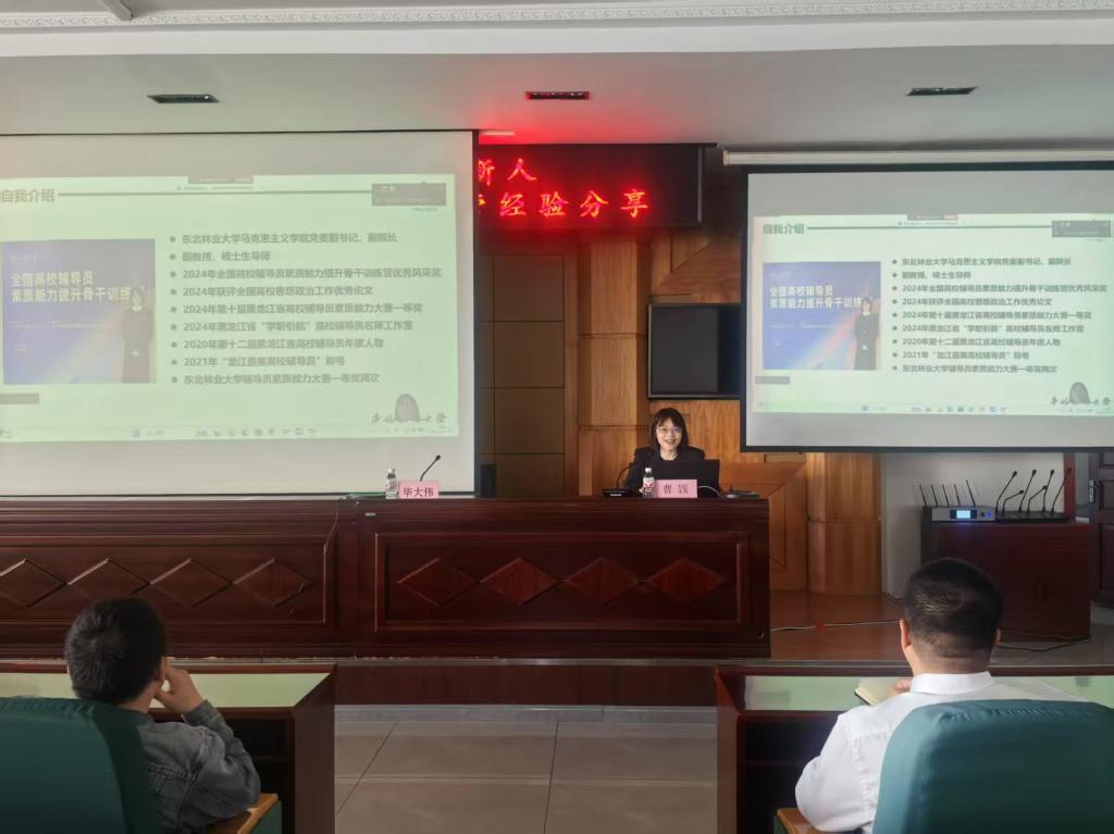 5 月 15 日上午,东北林业大学马克思主义学院党委副书记、副院长曹颖教授,为我校辅导员带来题为《以赛促学强本领,以行践知育新人 —— 全国高校辅导员素质能力提升训练营经验分享》的讲座。学生工作部部长毕大伟、学生工作部党总支书记石倩、各二级学院党总支副书记、学管办主任,及全体辅导员、公寓辅导员参加此次培训。