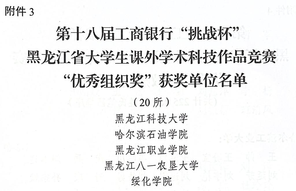 近日,我校喜获第十八届“挑战杯”黑龙江省大学生课外学术科技作品竞赛“优秀组织奖”。