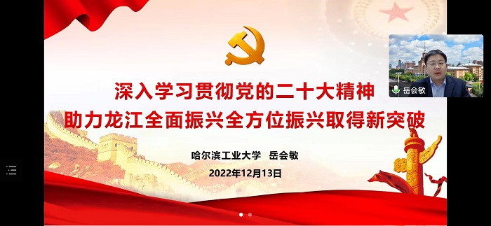 12月13日下午,黑龙江省教育系统学习贯彻党的二十大精神宣讲团为我校宣讲党的二十大精神,哈尔滨工业大学党委宣传部常务副部长岳会敏以《深入学习贯彻党的二十大精神 助力龙江全面振兴全方位振兴取得新突破》为题,线上为全校师生进行了提纲挈领、条分缕析的讲解。副校长郑福贵主持会议。学校领导班子成员、全体处级干部和师生代表参加会议。