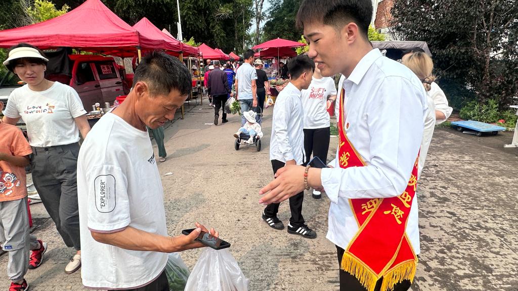 ▲学生志愿者向赶集村民发放食品药品安全宣传彩页